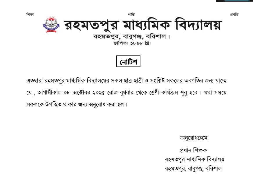০৮ অক্টোবর ২০২৫ রোজ বুধবার থেকে শ্রেণী কার্যক্রম শুরু । |